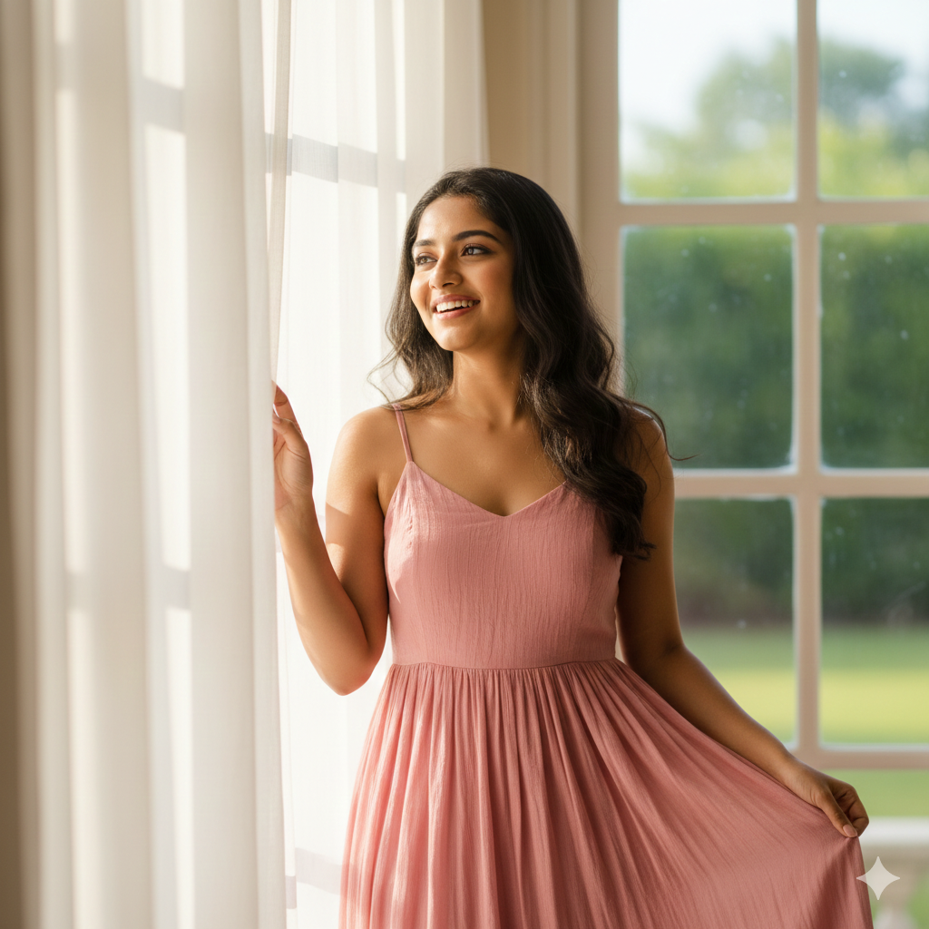 ✔ “A 25-year-old Indian girl smiling, wearing a pink dress, standing near a window, natural sunlight, ultra-realistic portrait photo.”