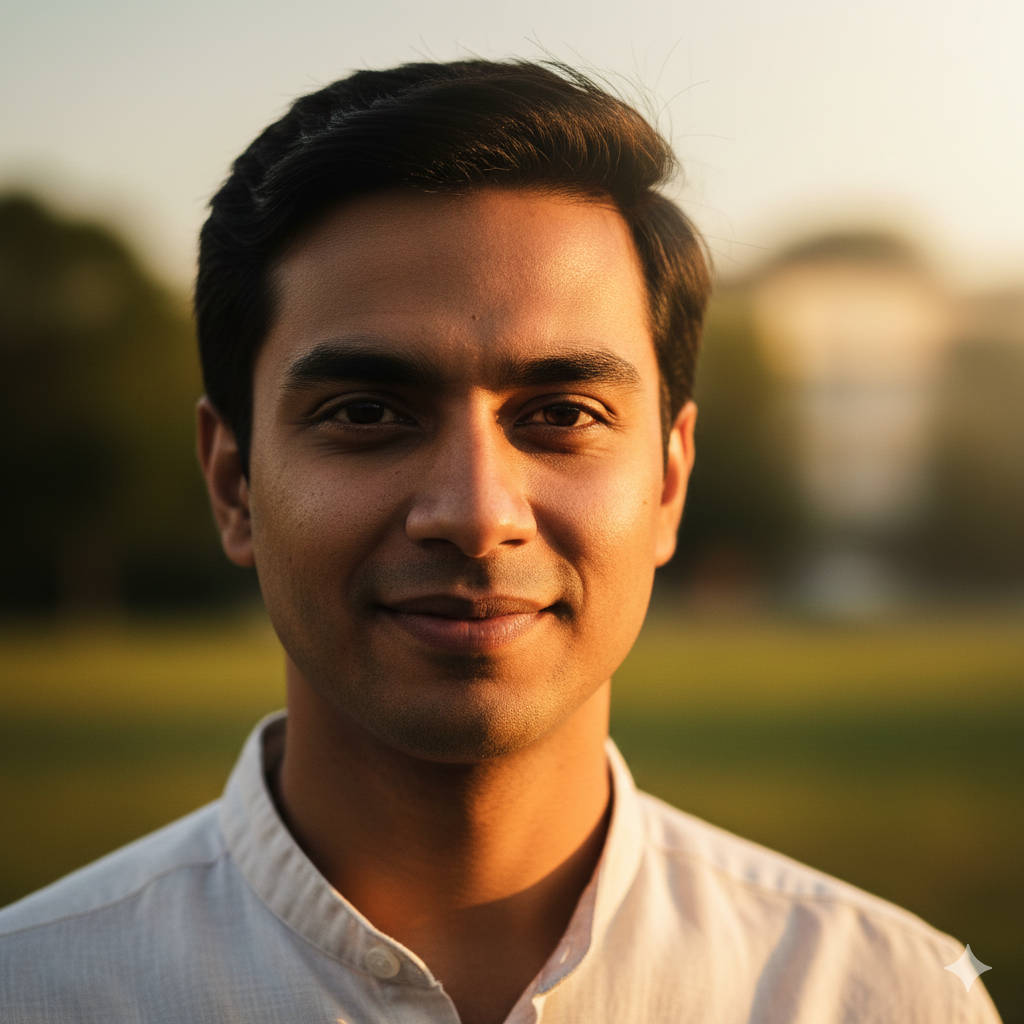 “Ultra-realistic portrait of a 27-year-old Indian man, warm golden hour lighting from the right, slight smile, 85mm DSLR lens, shallow depth of field, detailed skin texture, cinematic color grading.” Create an Image