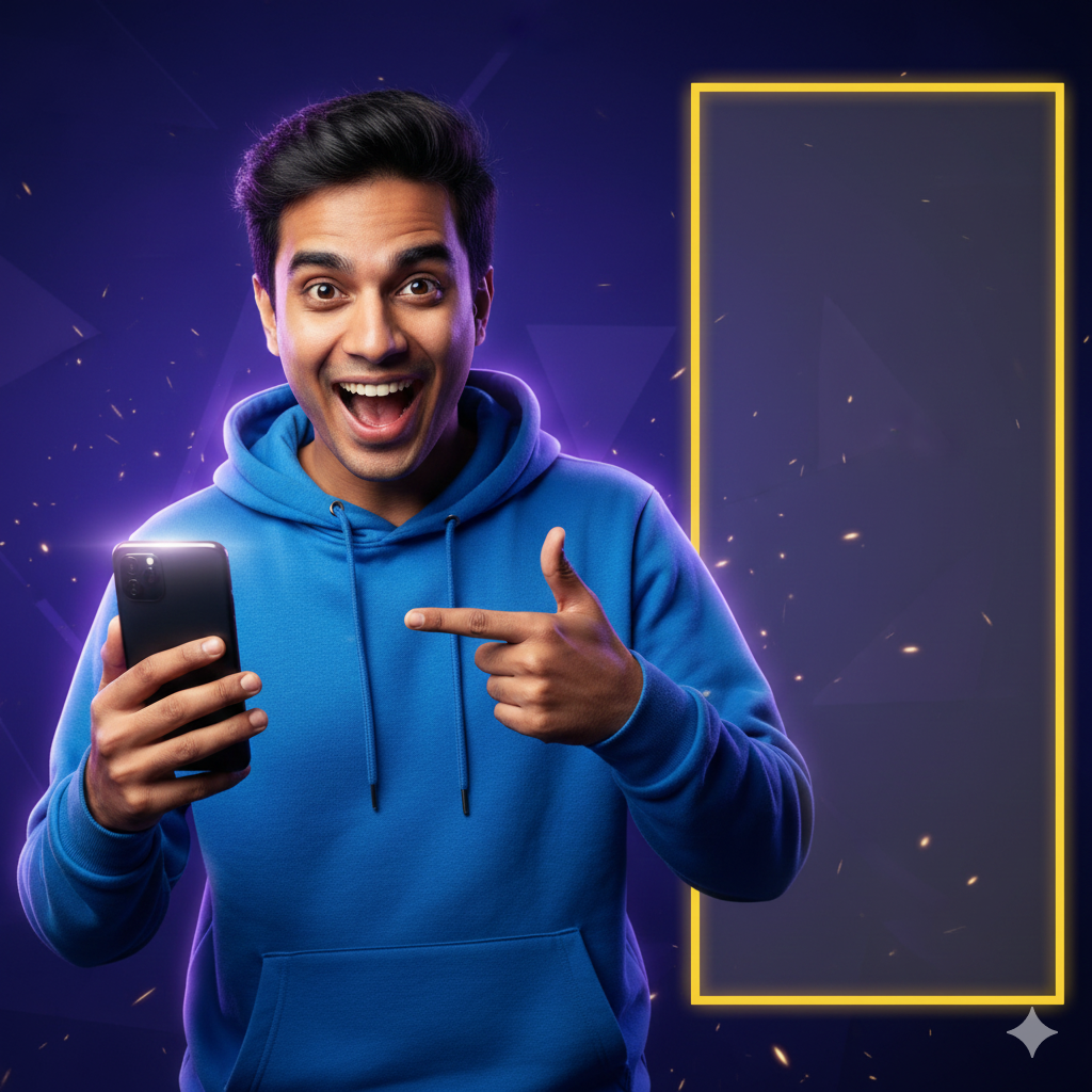 “Vibrant YouTube thumbnail — excited man pointing to phone, bold text space on right (leave blank), high-contrast lighting, studio background, energetic mood, 1280×720.”