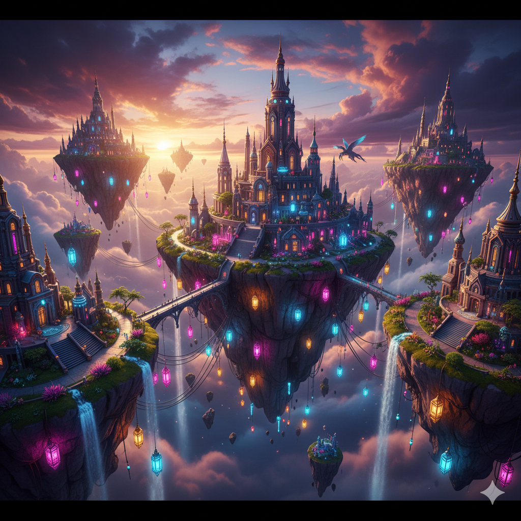 “Epic fantasy city at dawn, floating islands, neon lanterns, cinematic wide-angle, dramatic clouds, highly detailed 3D render, vibrant colors, 16:9.” Create an Image