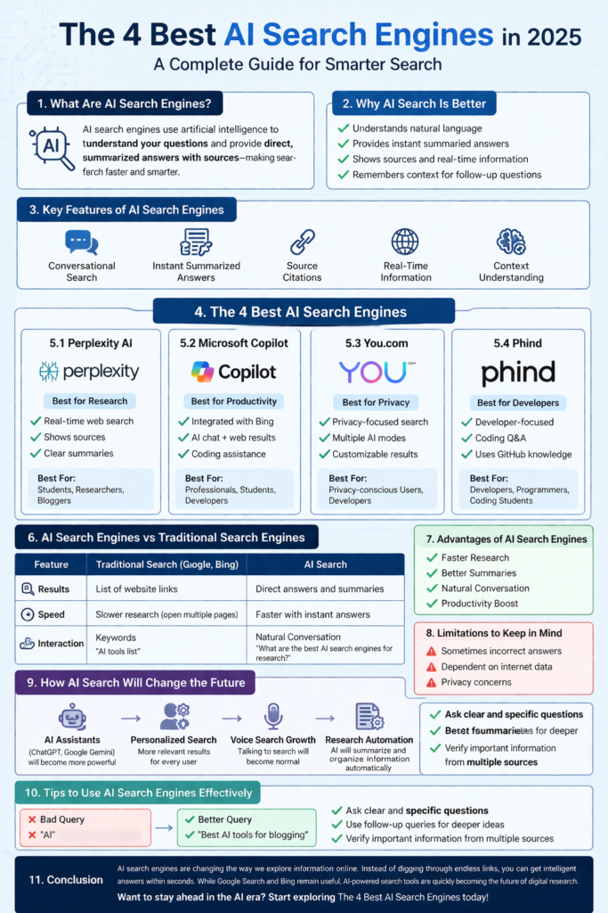 Because of these advanced technologies—including NLP, machine learning, web data analysis, and AI summaries—the tools featured in The 4 Best AI Search Engines are transforming how people explore information on the internet.