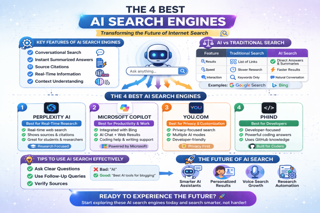 Together, these tools demonstrate how artificial intelligence is transforming the way people search for information online. Each platform in The 4 Best AI Search Engines offers unique features designed to make research, learning, and problem-solving faster and more efficient.