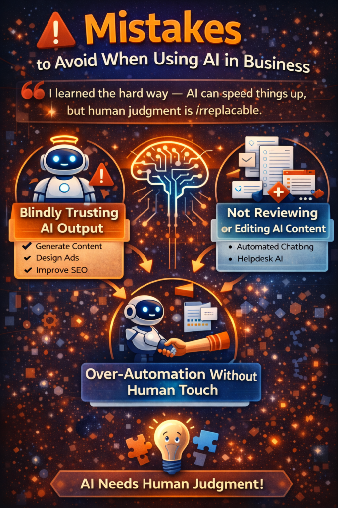 AI can be a powerful support system, but only when used wisely. When I first started experimenting with the best AI tools for business, I made some mistakes that slowed me down instead of helping me. These lessons come from real-world experience, not theory. If you’re using or considering using AI, avoiding these mistakes will save you time, money, and frustration.
